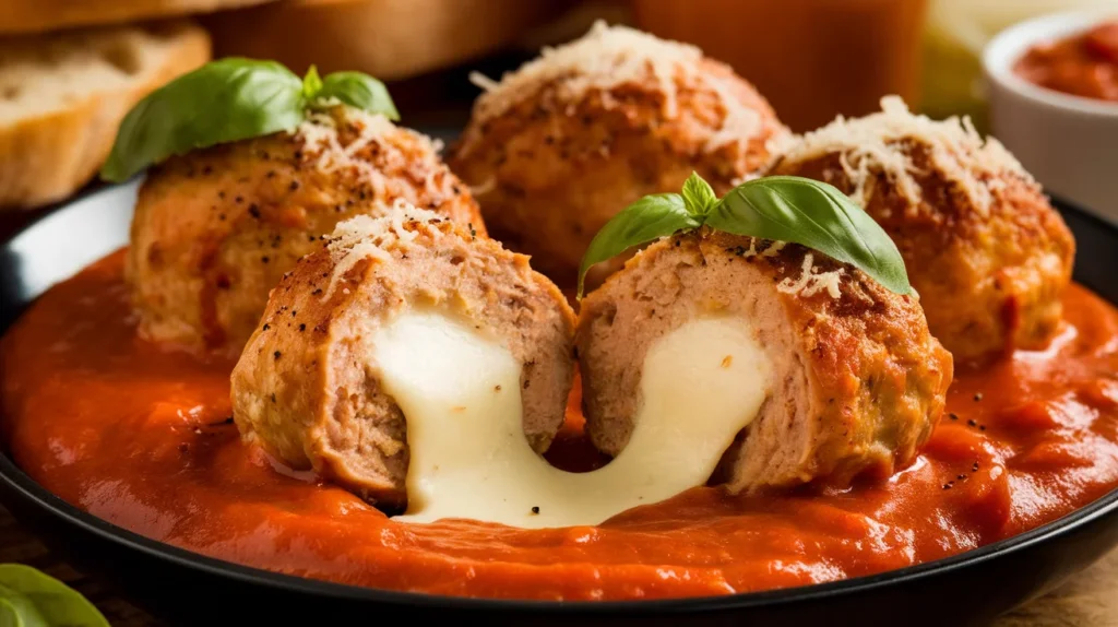 Baked Mozzarella Stuffed Chicken Meatballs in Tomato Cream Sauce