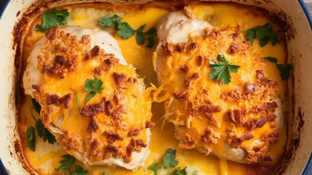 This Cheesy Baked Chicken with a Golden Cracker Topping is the kind of dinner that feels nostalgic, indulgent, and weirdly impressive… yet requires minimal effort.