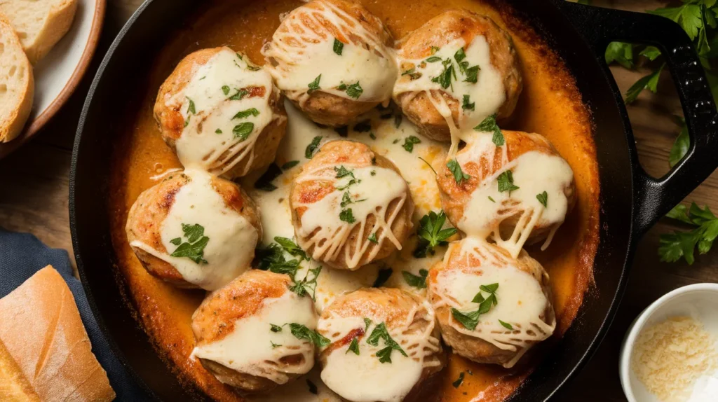Creamy Garlic Chicken Parmesan Meatballs with Mozzarella
