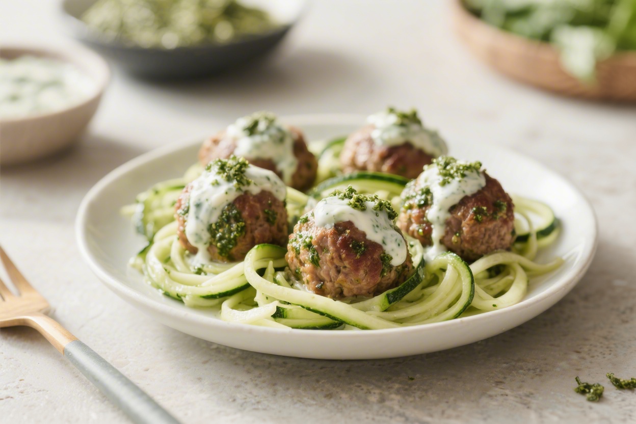 Creamy Pesto Zucchini Noodle Meatballs (Low Carb) – Comforting, Fresh, and Weeknight-Friendly