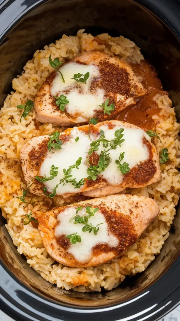 • Cook first, then add rice: Cover and cook on High for 2 hours (or Low for 3–4 hours) to get the chicken started and build flavor. This prevents mushy rice later.