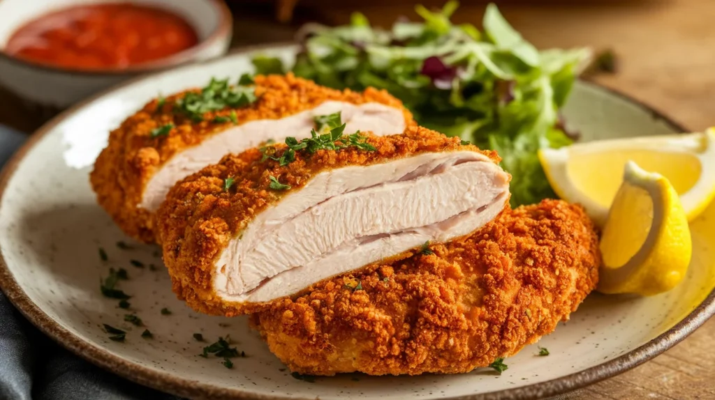 Let the cutlets rest for 5 minutes. Garnish with parsley and a squeeze of lemon. Then serve immediately while they’re hot and crispy.
