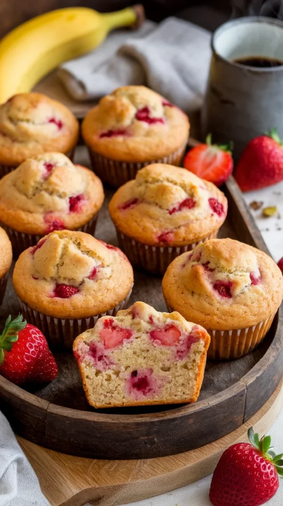 Because it’s basically banana bread’s cooler cousin—faster, cuter, and portable. No slices. No forks. Just grab-and-go fruity goodness. The bananas make the muffins naturally moist, the strawberries add juicy pops of flavor, and the whole thing tastes like a bakery treat without you mortgaging your soul at a hipster coffee shop. It’s also a one-bowl recipe (fewer dishes = more life joy). Honestly, it’s idiot-proof—if I didn’t burn it, you probably won’t either.